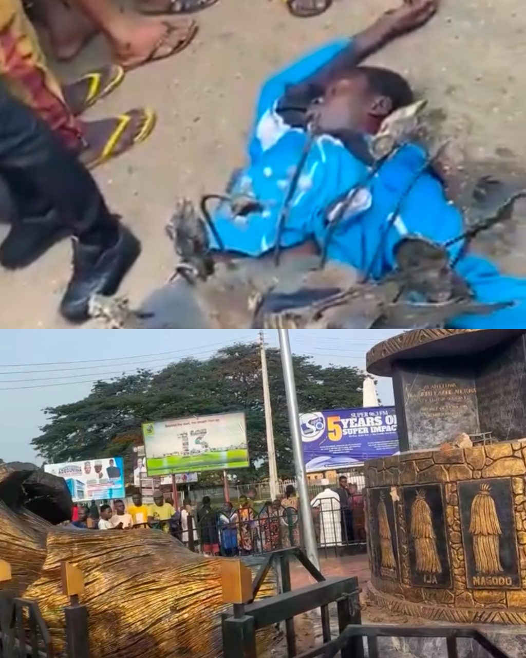 A suspected thief, allegedly identified as Jeremiah Kosesochi Nwoke has reportedly died while attempting to cart away the Agemo statue located at the Itoro Roundabout in Ijebu Ode.