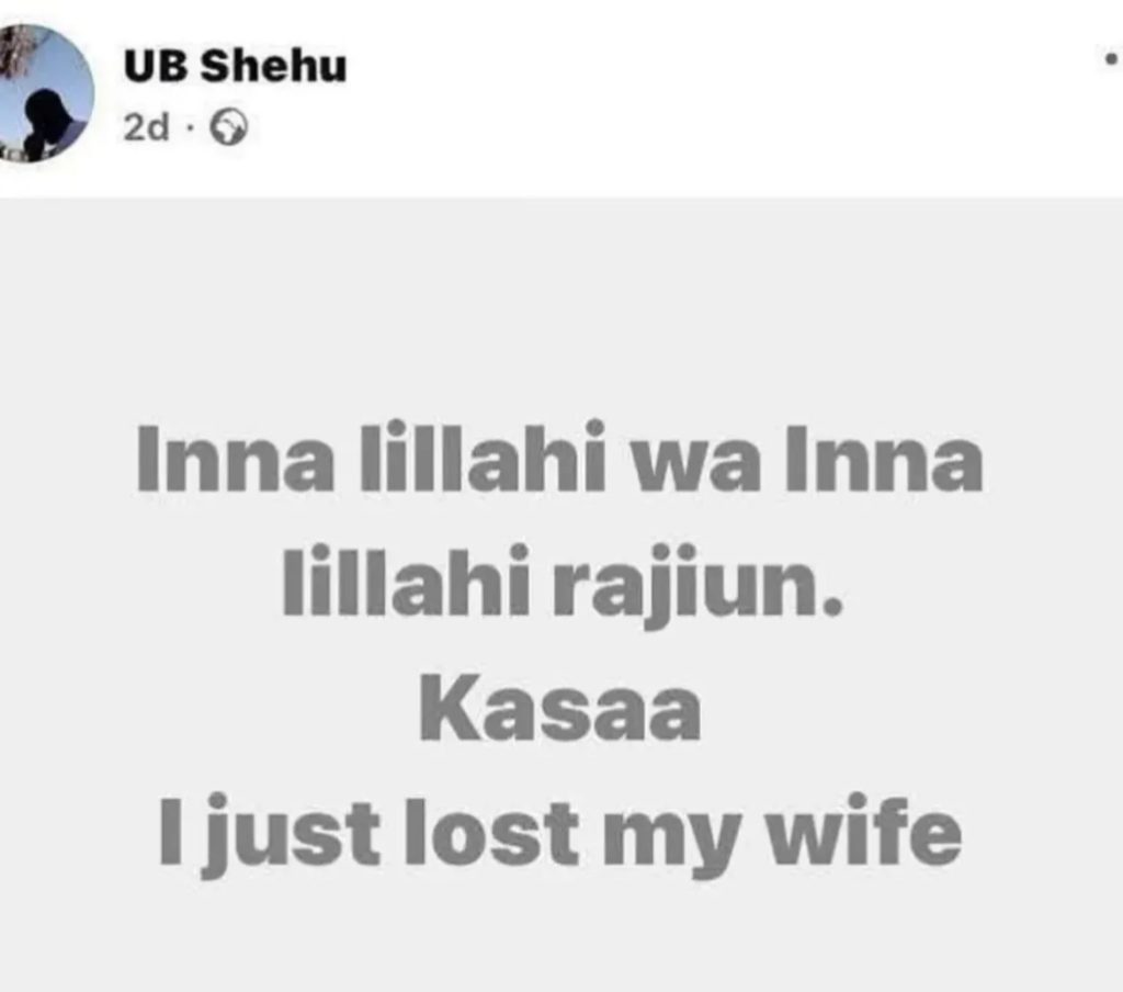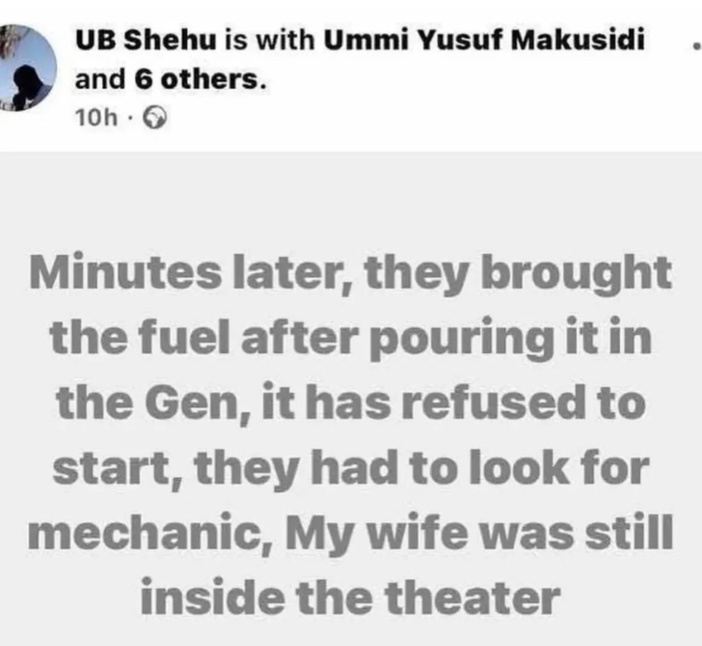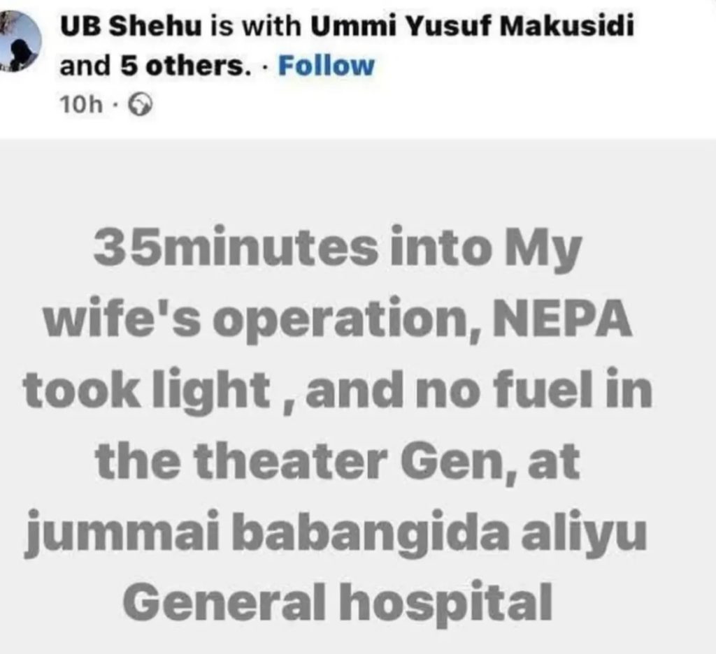 A Nigerian man, identified as UB Shehu on Facebook, has shared how he lost his wife due to a power failure during her surgery.
