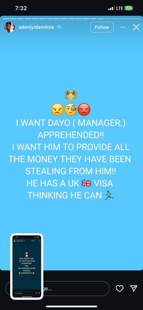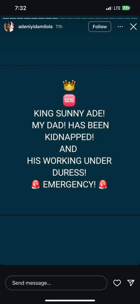 In a series of viral posts, Damilola alleged that King Sunny Ade had been kidnapped by his stepbrother and manager, Dayo, along with other family members.