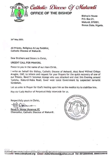Confirming the attack, Rev. Fr. Joseph Beba, Chairman of the Diocesan Priests Association, described the situation as heartbreaking. He disclosed that Fr. Atongo survived the gunshots and was rushed to a hospital where he remains in critical condition.