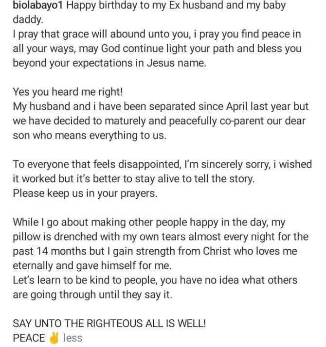 “Yes you heard me right! My husband and I have been separated since April last year but we have decided to maturely and peacefully co-parent our dear son who means everything to us.”