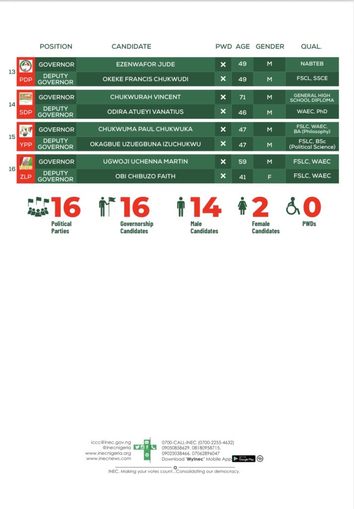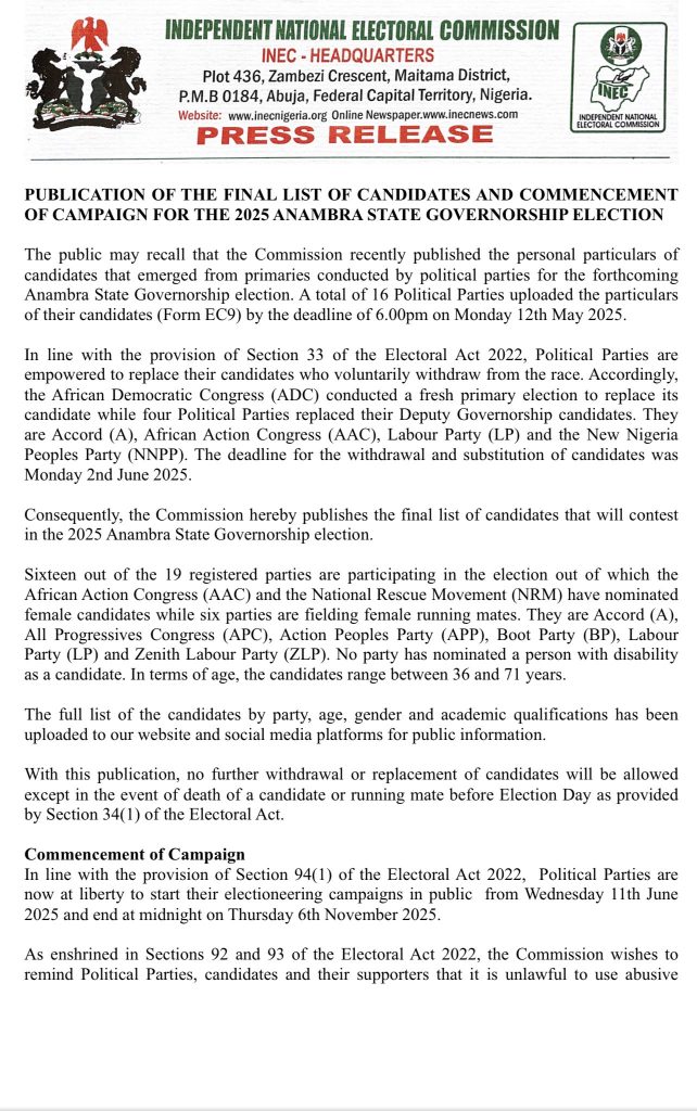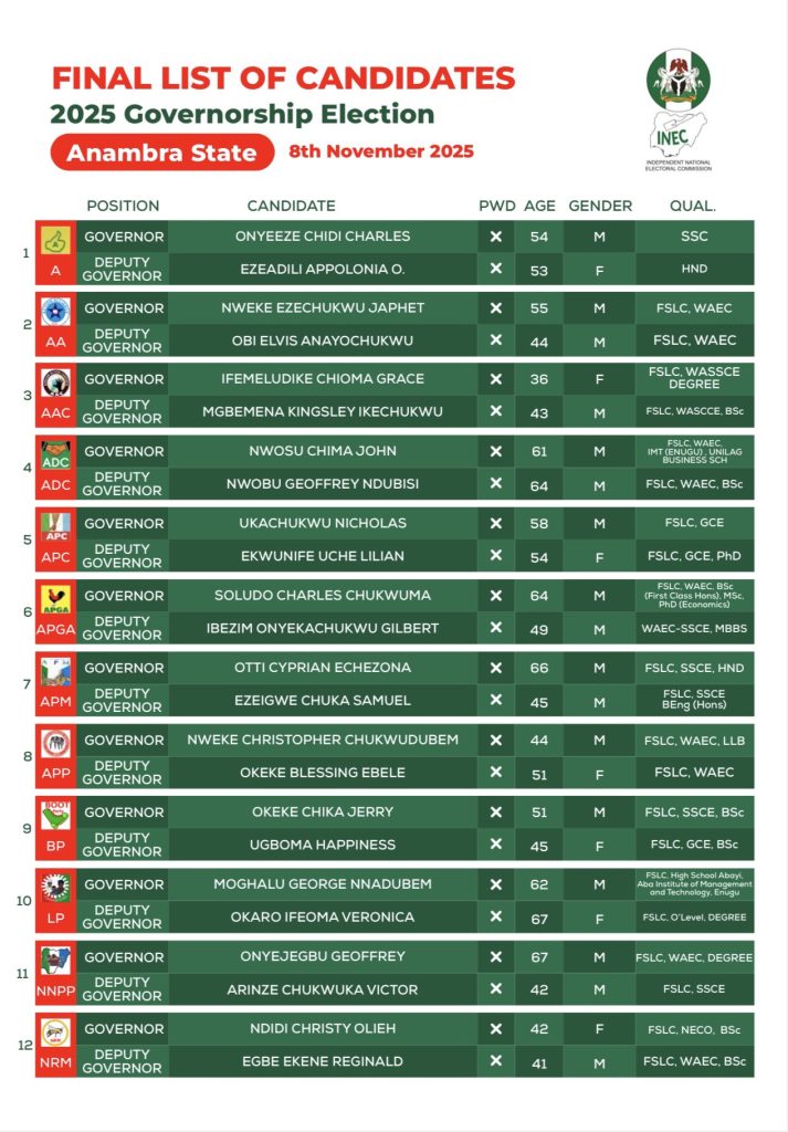 The Independent National Electoral Commission (INEC) has released the final list of candidates for the Anambra governorship election scheduled for November 8, 2025.