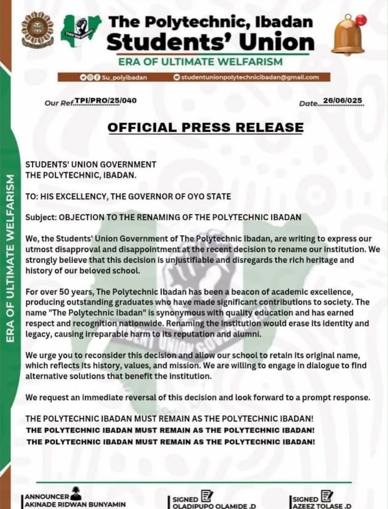The statement read: “We, the Students’ Union Government of The Polytechnic Ibadan, are writing to express our utmost disapproval and disappointment at the recent decision to rename our institution.