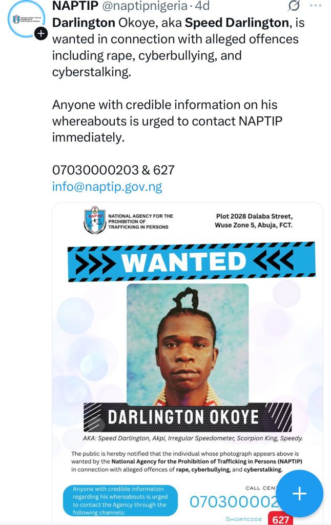 The National Agency for the Prohibition of Trafficking in Persons (NAPTIP) has escalated its pursuit of controversial entertainer Darlington Okoye, popularly known as Speed Darlington, by placing him on an international watchlist and alerting Interpol.