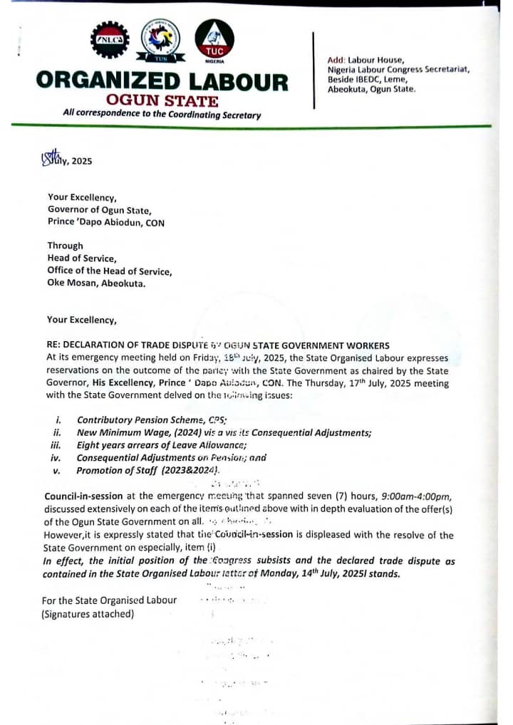 The letter addressed to Governor Abiodun through the Head of Service was signed by top officials of the NLC, TUC, and JNC, reaffirming a united labour front in the ongoing agitation.
