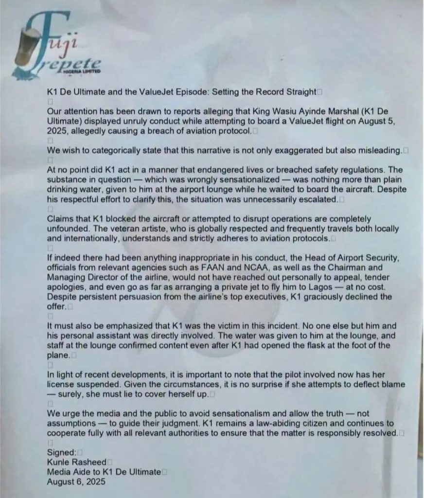 Fuji star Wasiu Ayinde, popularly known as K1 De Ultimate, has addressed claims that he caused a major aviation safety breach on a ValueJet flight on August 5.