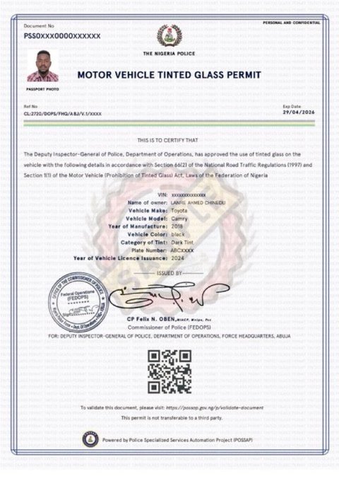 The NPF, under the directive of Inspector General of Police Kayode Adeolu Egbetokun, reactivated the digital Tinted Glass Permit system earlier this year, with a 30-day grace period from May 1 to May 30, 2025, to allow vehicle owners to regularize their permits.