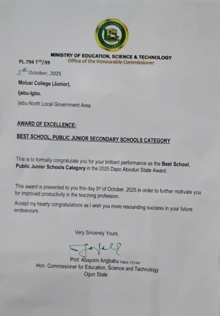Molusi College Junior, Ijebu-Igbo, has achieved a landmark recognition, emerging as the Best Public Junior Secondary School in Ogun State at the 2025 Dapo Abiodun State Education Awards. The prestigious honour comes with a ₦10 million development grant, marking a major milestone in the school’s journey of excellence.