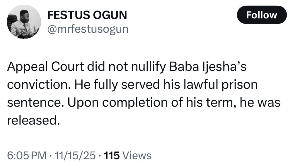 “The Appeal Court did not nullify Baba Ijesha’s conviction. He fully served his lawful prison sentence. Upon completion of his term, he was released,” Ogun said, addressing the misinformation circulating online.