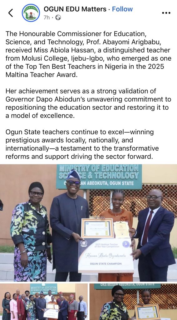 Miss Hassan’s outstanding recognition underscores the dedication and excellence of Ogun State educators and serves as a strong validation of Governor Dapo Abiodun’s unwavering commitment to repositioning the state’s education sector. The governor’s reforms aim to restore education in Ogun State to a model of excellence, empowering teachers and students alike to achieve their fullest potential.