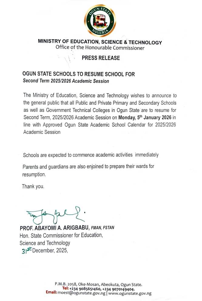 The Ogun State Ministry of Education, Science and Technology has announced that all schools across the state will resume for the Second Term of the 2025/2026 academic session on Monday, January 5, 2026.