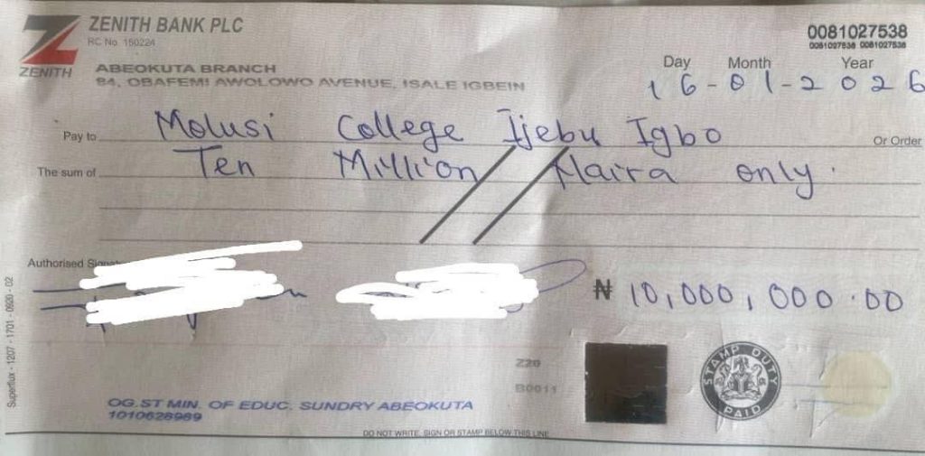 Ijebu-Igbo, Ogun State – In a historic and celebratory moment for Molusi College Junior, Ijebu-Igbo, His Excellency, Prince Dr. Dapo Abiodun – MFR, CON, the Executive Governor of Ogun State, has fulfilled his promise by releasing a N10 million grant to the school. The grant recognizes the institution as the 2025 Ogun State Overall Best Junior School, a testament to its commitment to academic excellence and discipline.