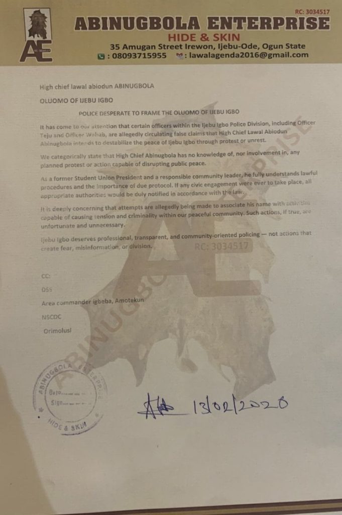 In a letter reportedly written by Alhaji Chief Ismail Olawale Lawal Abinugbola and addressed to the DSS, concerns were raised about claims allegedly being circulated within the Ijebu-Igbo Police Division. The petition specifically mentioned Officer Teju and Inspector Wahab, who were accused of spreading information suggesting that the Oluomo of Ijebu Igbo intends to destabilize the peace of the community through protest or unrest.