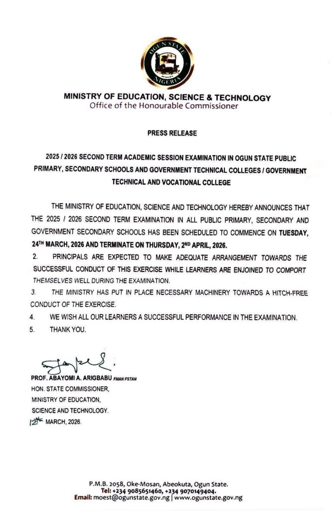 The Ogun State Government has officially announced the timetable for the 2025/2026 second-term examinations in all public primary and secondary schools across the state.
