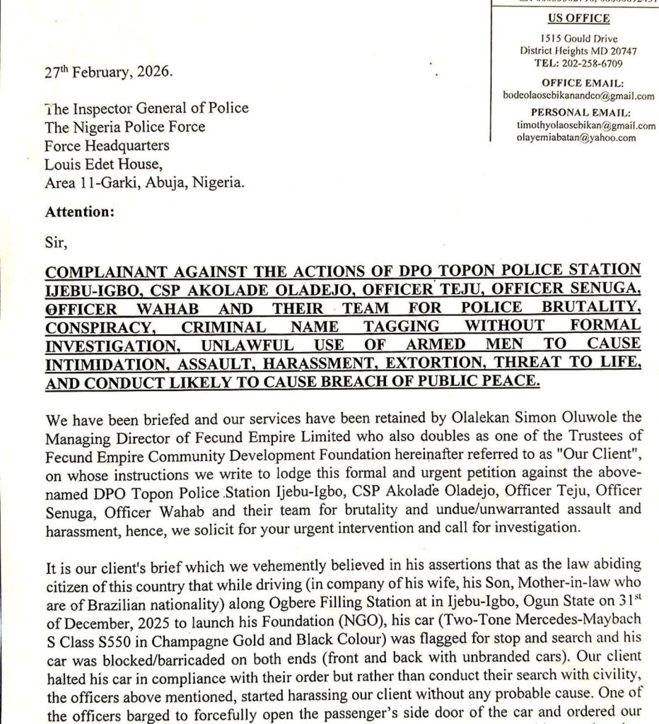 A Brazil-Lagos based businessman, Mr. Olalekan Simon Oluwole, along with his wife and foreign family members, has filed a petition against some officers of the Nigeria Police Force over alleged harassment and brutality in Ijebu Igbo, Ogun State.
